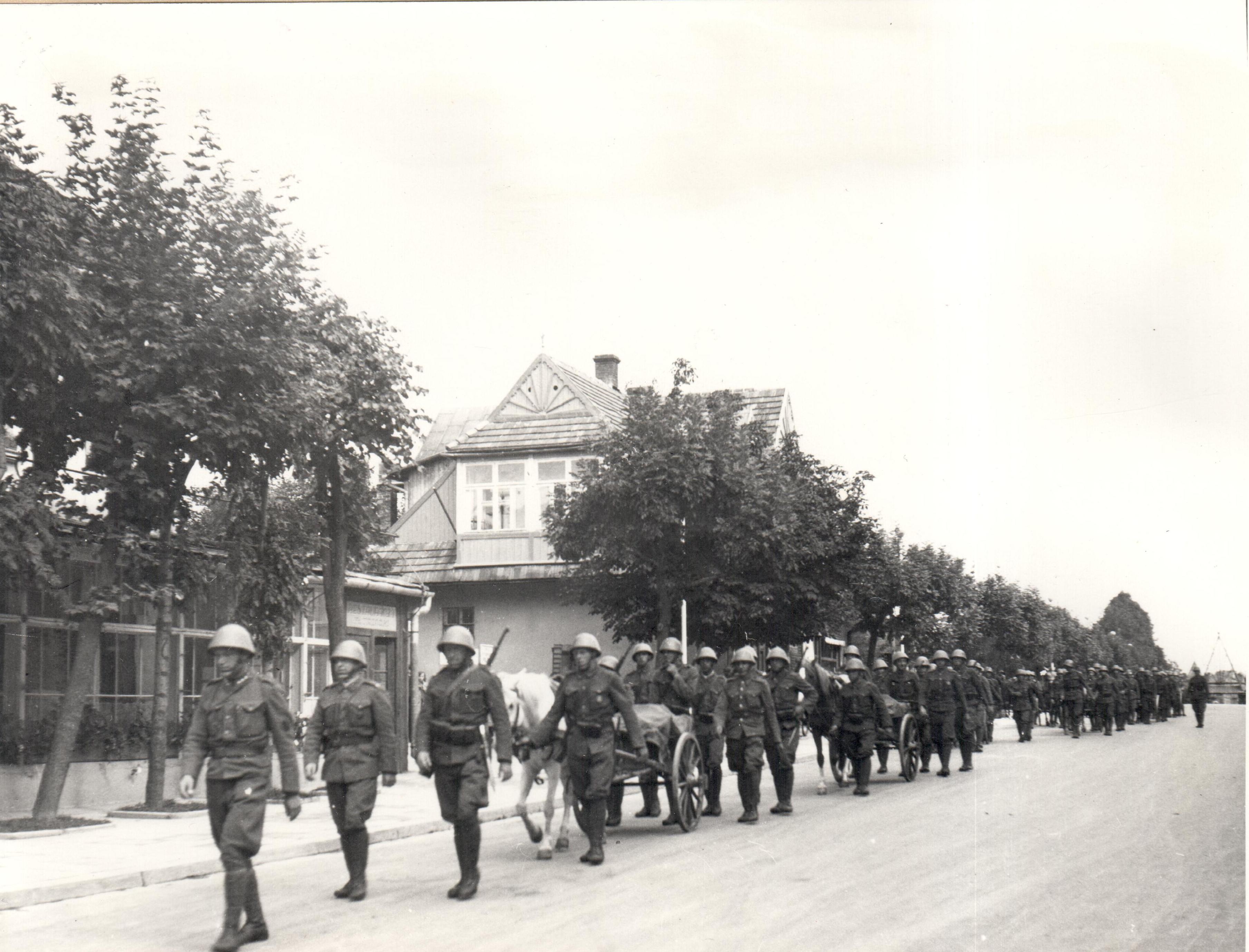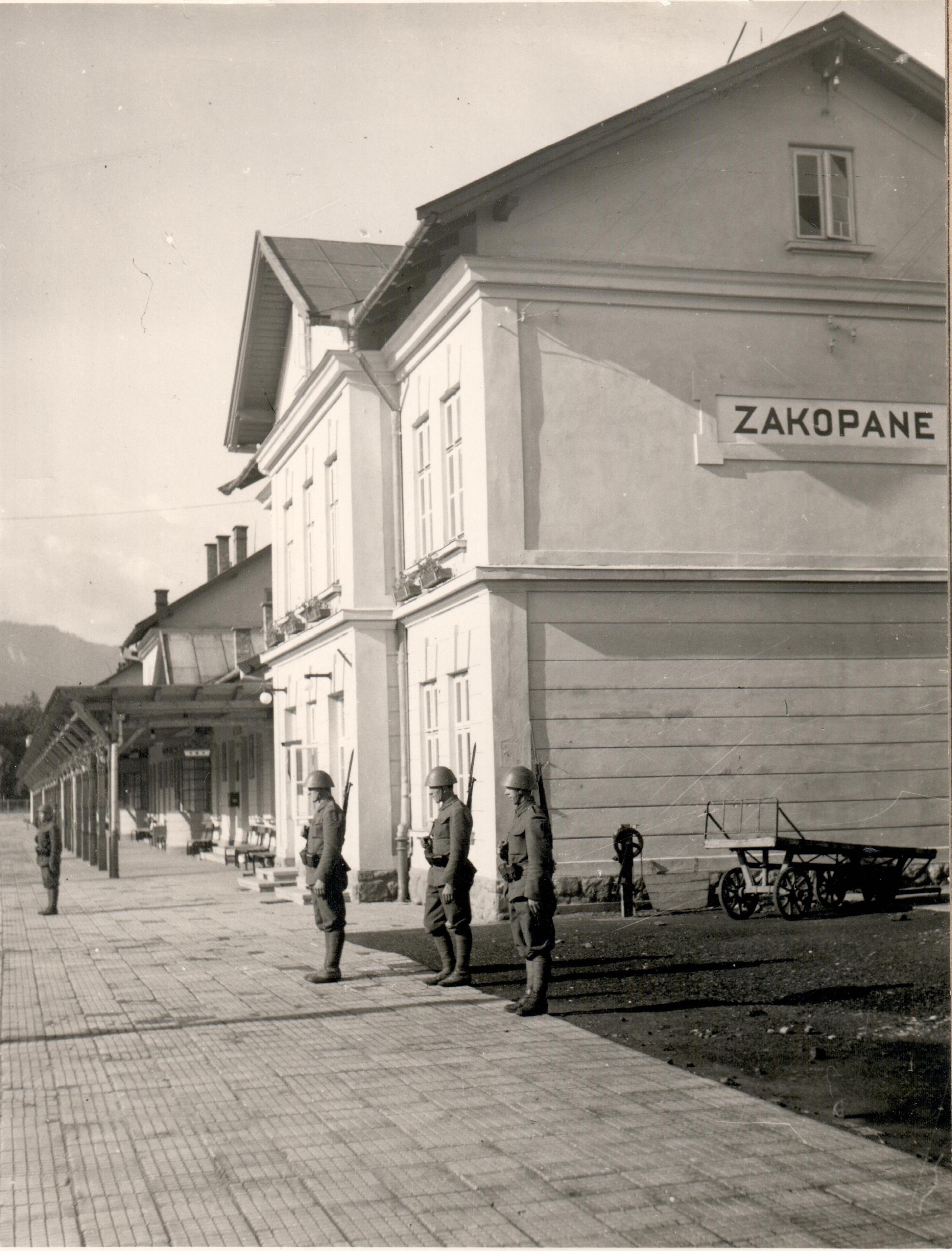 Slovenskí vojaci na stráži pred železničnou stanicou v Zakopanom