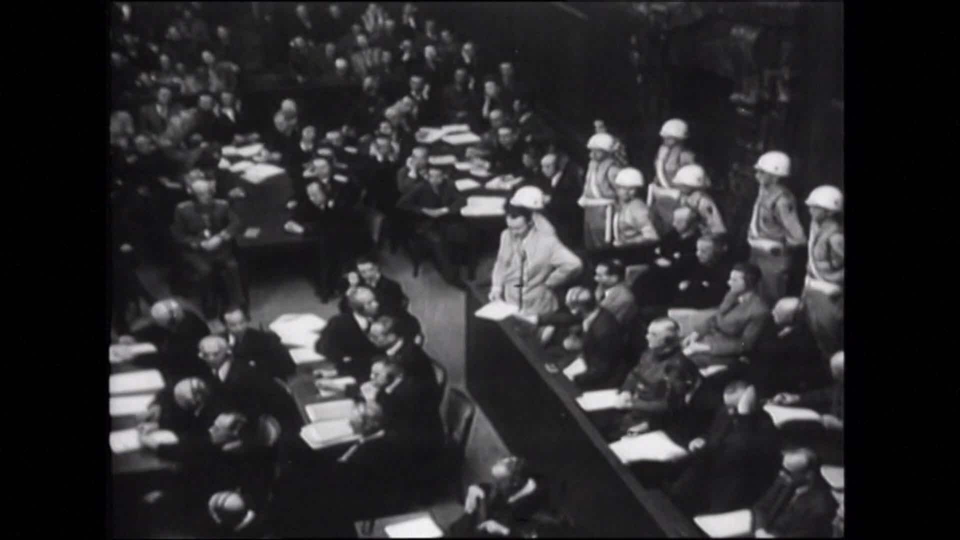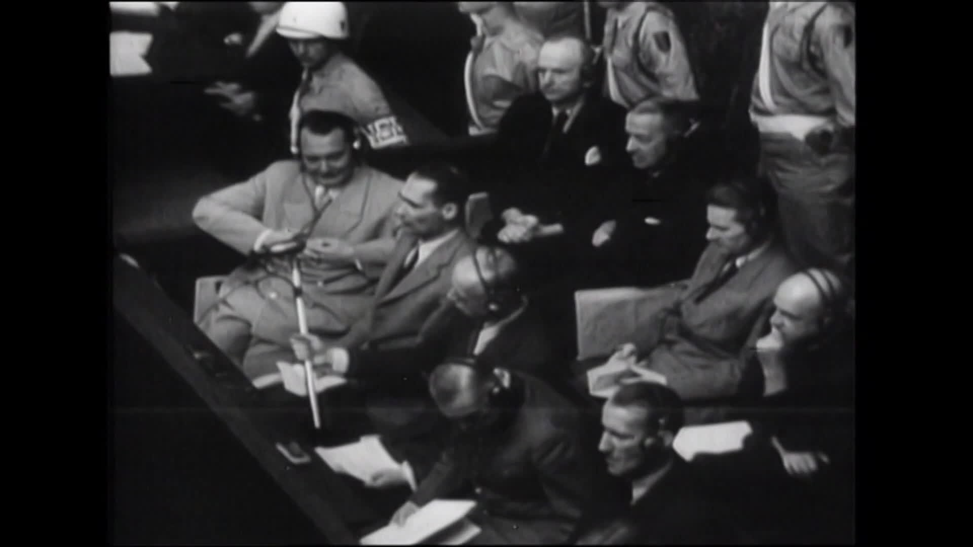 Záber z filmového záznamu vyhotoveného počas Norimberského procesu, ktorý zachytáva obžalovaných